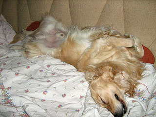 na komendę "zdechł pies" kładzie się na ziemię na boku i udaje zdechłego.