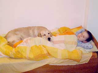 Bono zasypiający wieczorkiem koło łóżka,