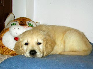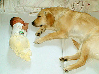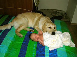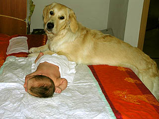 na Goldena zwłaszcza przy kąpieli ;) Synek zresztą bardzo lubi Jej towarzystwo